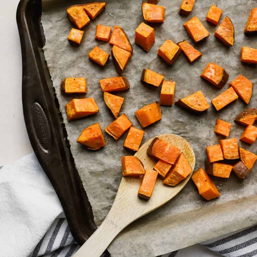 Easy roasted sweet potatoes that come together in 30 minutes using your oven! These are perfect as a simple side dish that the whole family will love, or a sweet and comforting add-in to your favorite salad, bowls, or tacos.