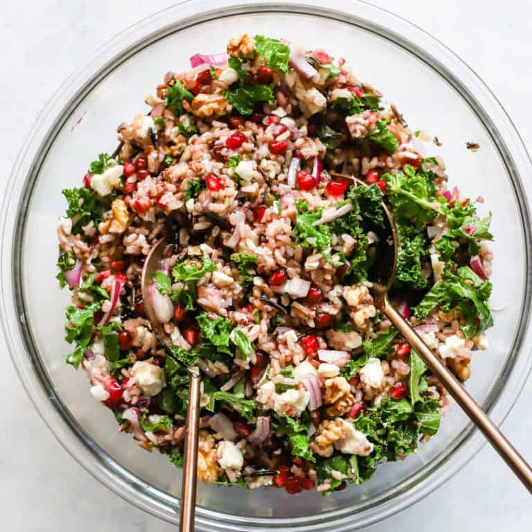 This wild rice salad is packed with pomegranate, kale, feta, and walnuts for a colorful, hearty salad that's perfect for fall and winter gatherings. Better yet, it can be made ahead!