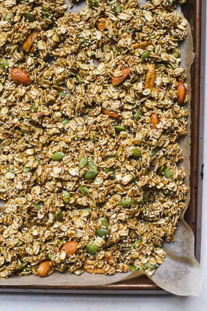 This nourishing pumpkin granola is the cozy breakfast recipe you need this fall! With wholesome ingredients like pumpkin seeds, quinoa, canned pumpkin purée, and warm pumpkin pie spices, it's perfect for topping yogurt bowls, baked fall fruits, and even oatmeal.
