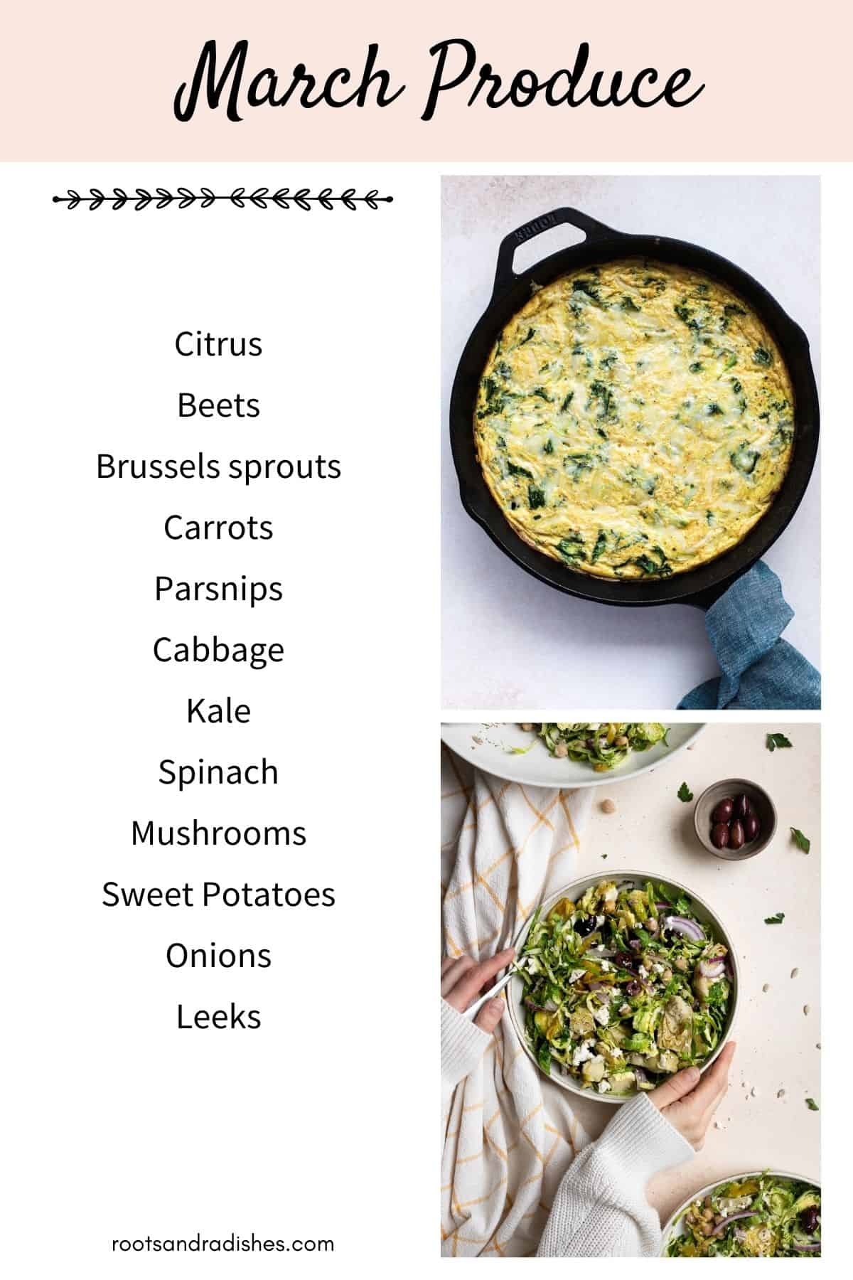 These cooler-weather, hardier veggies are still in season in March, and still delicious as roasted veggie sides, or in soups and salads.