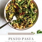 This pesto pasta with veggies comes together with roasted mushrooms and asparagus, sun-dried tomatoes, and whatever pesto you have on hand! A nourishing and easy weeknight meal that uses seasonal produce.